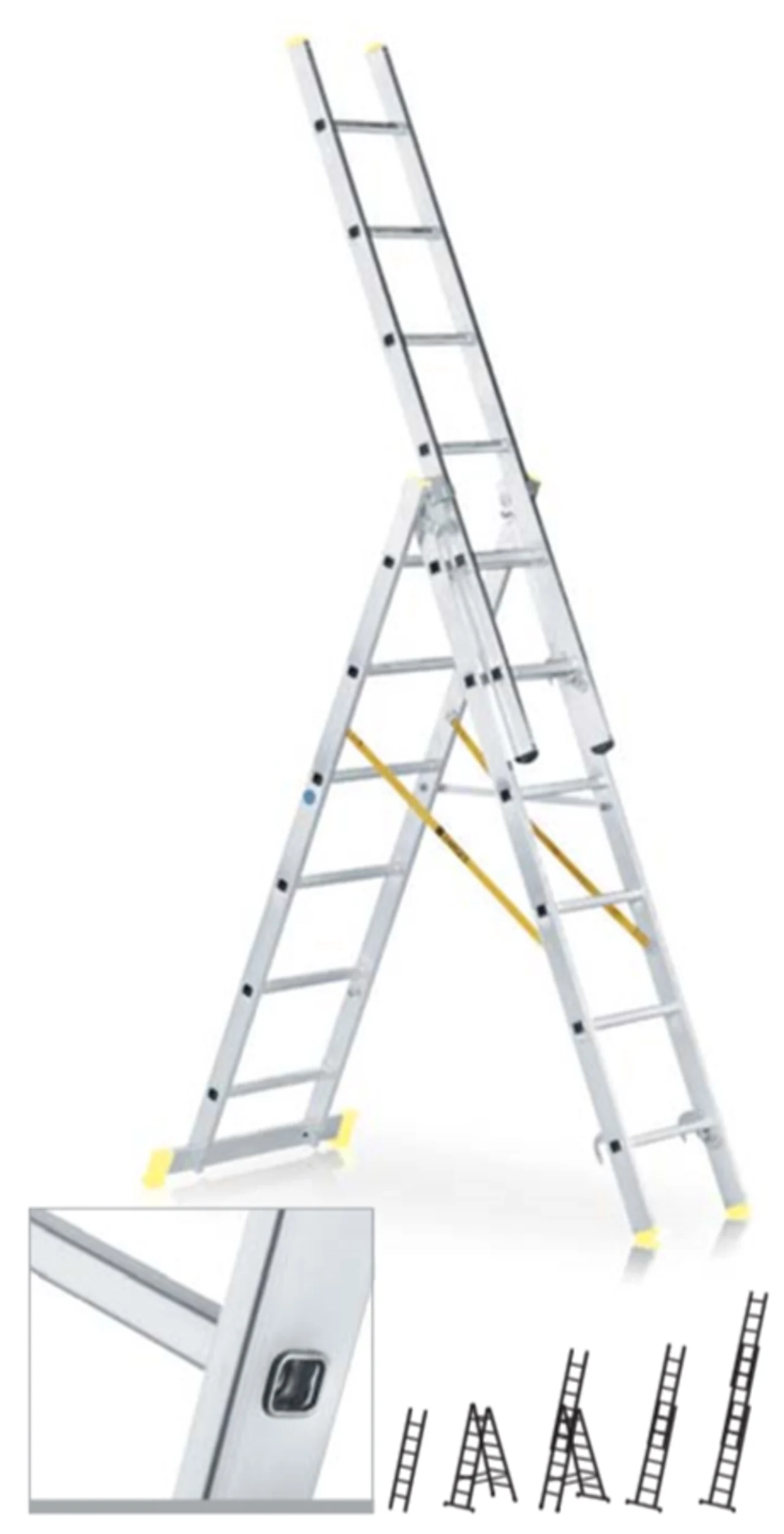 Kétágú állólétra, kihúzható 3. elemmel. Használható állólétraként, vagy egy-, két- illetve háromrészes támasztólétraként is. Az egyes létraelemeken kampós zár biztosítja a rögzítést és gátolja a létraelemek visszacsúszását. Az alsó létraelem széles gerendával van szerelve az oldalirányú dőlés kiküszöbölése érdekében. A fokok és létraszárak összekötése minőségi Zarges peremezéssel készül. Kétágú létraként való használatkor nagy szakítószilárdságú perlon heveder gátolja meg az esetleges szétcsúszást.